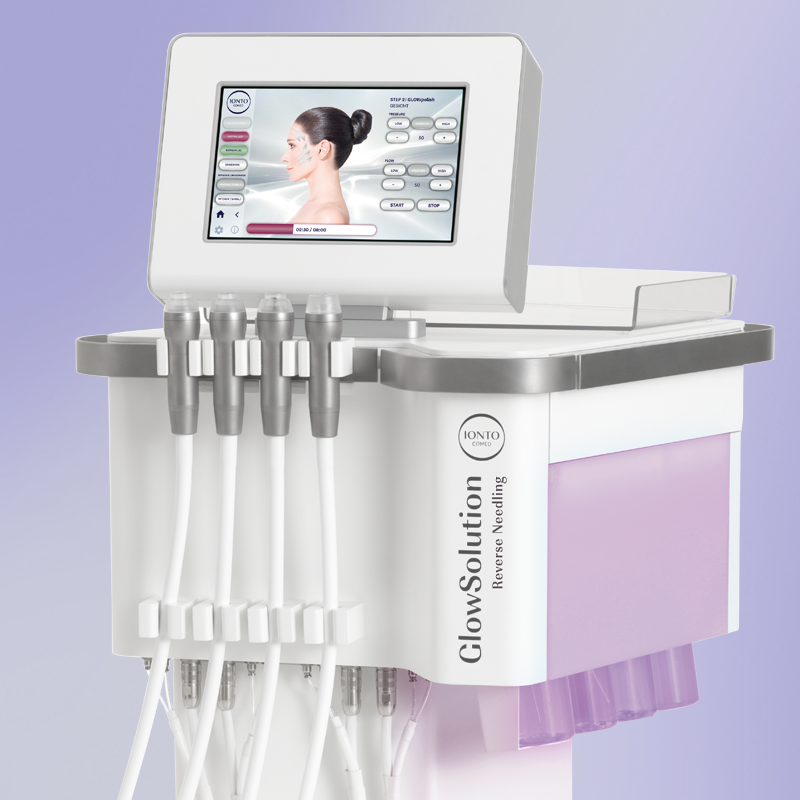 Mit spezialisierten Handstücken für eine vollautomatisch elektronisch gesteuerte Durchführung und abgestimmten Wirkstoffflüssigkeiten (Solutions) sorgt GlowSolution Reverse Needling für eine glattere Haut mit "De-Puff" Effekt in Kombination mit Schritt 1, Schritt 2 und Schritt 4 von GlowSolution.